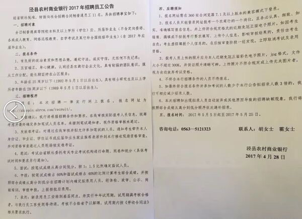 2017年安徽宣城涇縣農村商業銀行社會招聘簡章已在銀行招聘網發布,報名時間截至2017年5月25日,詳情如下: