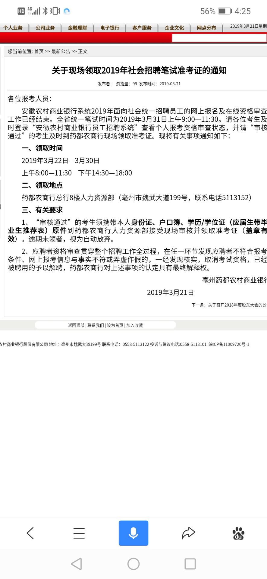 [安徽]2019年安徽亳州藥都農商行社會招聘現場領取準考證通知