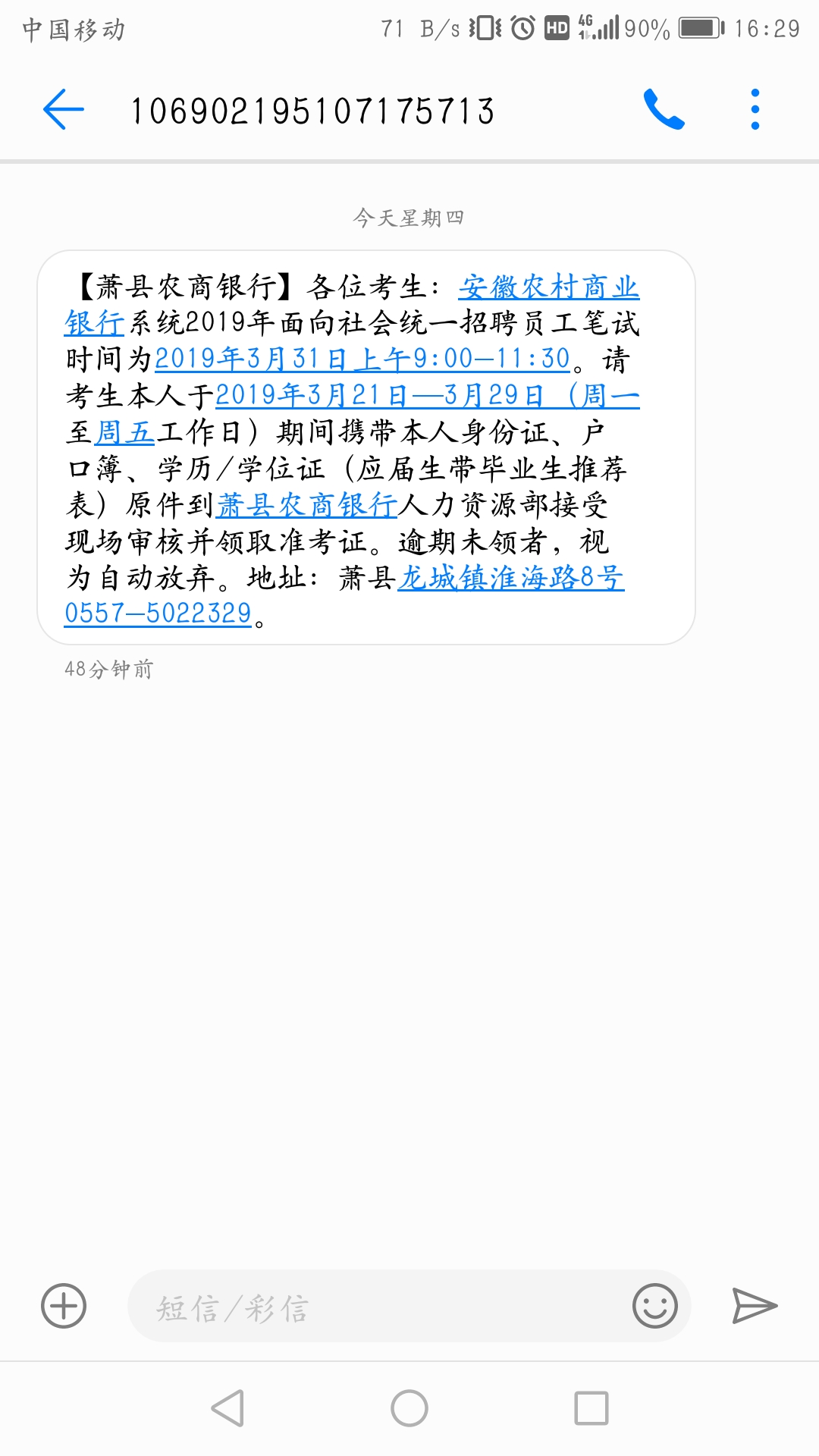 [安徽]2019年安徽蕭縣農商行社會招聘現場領取準考證通知