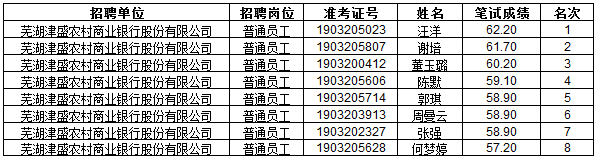 根據蕪湖津盛農商銀行2019年社會招聘簡章,本行計劃招聘普通員工5人。根據計劃招聘人數1:1.5比例,確定進入面試人數為8人。依據普通員工崗位考生筆試成績從高分到低分排序,2019年蕪湖津盛農商銀行面向社會招聘普通員工崗面試入圍分數線為“57.2分”。現將面試入圍人員公示如下: