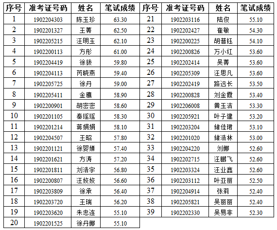 安徽農村商業銀行員工招聘系統自行查詢筆試成績,本行不再另行電話通知),2019年我行面向社會招聘普通員工面試入圍分數線為“52.30分”;計算機、法律專業報考入圍人員名單詳見安徽農村商業銀行員工招聘系統另行公告通知。現將相關事項通知如下: