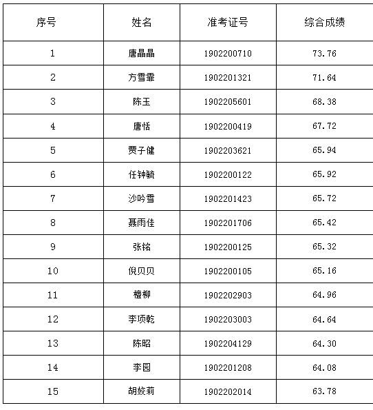 根據(jù)《石臺農(nóng)村商業(yè)銀行2019年社會招聘簡章》規(guī)定,經(jīng)筆試、面試,按照考生筆試成績占60%、面試成績占40%的比例統(tǒng)計應(yīng)聘者綜合成績,下列15人為本次招聘擬錄用人員,現(xiàn)予以公示: