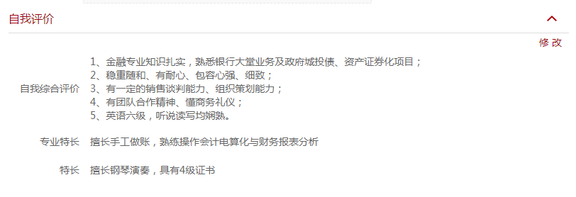 同時(shí)也是因?yàn)楹芏鄬W(xué)生沒(méi)有正規(guī)的實(shí)習(xí)只有一些零散的兼職活動(dòng),這里的話就盡量寫(xiě)和同學(xué)所報(bào)銀行崗位相關(guān)的一些兼職經(jīng)歷,描述過(guò)程中注意用詞盡量用數(shù)據(jù)和技能說(shuō)話。