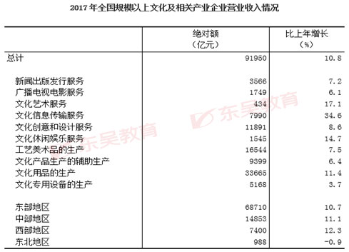 【2019年江蘇農商行真題】據對全國規模以上文化及相關產業5.5萬家企業調查,2017年,上述企業實現營業收入91950億元,比上年增長10.8%,增速提高3.3個百分點,繼續保持較快增長。