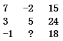 (2019年交通銀行)下面是一個三行三列的數字陣型,填入問號處的數字為( )。