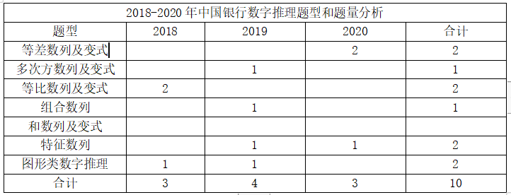 交通銀行校園招聘考試中,數字推理一般放在邏輯判斷當中考查,一般考查3-4題。數字推理題目涉及的考點較多,如:等差數列及變式、等比數列及變式、多次方數列及變式、和數列及變式、特征數列、組合數列、圖形類數字推理。交通銀行的數字推理題近三年題目相對常規,考生重點把握常考題型的題型特征和解題思路即可。以下是各年份數字推理題型和題量的分析數據:2018-2020年中國銀行數字推理題型和題量分析