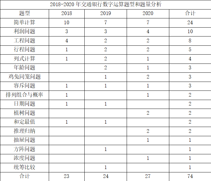 交通銀行校園招聘考試中,前些年沒有具體區分數字運算和思維策略,這兩類題型往往合在一起考查,題量從近三年題量來看,2018年考查了23題,2019年考查24題,2020年總共考查27道題,其中思維策略各劃分5題。這類題目主要考查考生對基本數字運算、對數據的理解和處理,以及在解決問題的發散思維能力。常考的題型:行程問題、工程問題、濃度問題、植樹問題、利潤問題、比例問題、幾何問題、概率問題、雞兔同籠問題、牛吃草問題、容斥問題、年齡問題等。考試難度一般中等偏下,大家可以提前進行有針對性復習。以下是近三年數字運算題型和題量的分析數據:2018-2020年交通銀行數字運算題型和題量分析