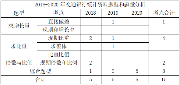 交通銀行校園招聘考試中,資料分析從2018年-2020年每年都考兩篇材料,均為10道題,其中一篇為需要計算的統計材料,另一篇為需要理解的文章閱讀。每篇資料分析有5道題目,并且其中必有1道綜合問題。資料分析考查的材料包括文字材料、統計表格、統計圖、綜合材料等類型。但目前交通銀行的統計材料均是文字+圖形類的資料分析。對于統計材料的計算,大家需要掌握基本的統計概念,熟悉大數據的快速計算技巧。以下是各年份統計資料的各題型和題量的分析數據:2018-2020年交通銀行統計資料題型和題量分析