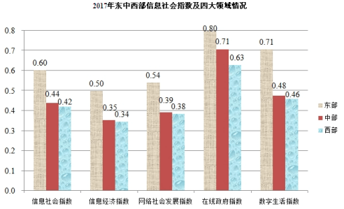 B.2017年信息社會指數及四大領域指數中,中部地區均處于中等水平