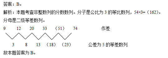 解析:本題考查作差型多級(jí)數(shù)列。相鄰兩項(xiàng)做差得到:5,2,7,4,9,6,11;再次做差得到:-3,5,-3,5,-3,5;為周期數(shù)列。則括號(hào)里填11+(-3)+46=54,故本題答案為D。
