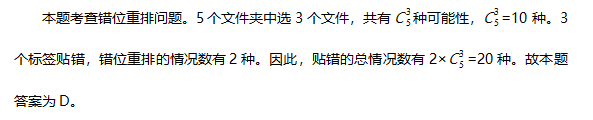 解析:本題考查容斥問題。至少喜歡兩種顏色的有19人,喜歡三種顏色的有3人,則喜歡兩種顏色的有19-3=16人。喜歡紅、黃、藍(lán)三色的人數(shù)相加,其中喜歡兩種顏色的被重復(fù)計(jì)算一次,喜歡三種顏色的被重復(fù)計(jì)算兩次,至少喜歡一種顏色的有20+20+15-16-2×3=33人。三種顏色都不喜歡的有40-33=7人。故本題答案為D。