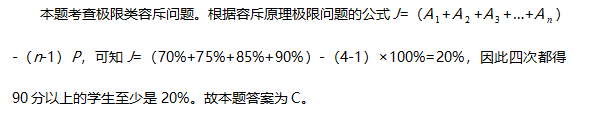 解析:本題考查最不利原則解題。題目中出現(xiàn)了“至少……才能保證”,符合最不利原則的題型特征,所以接下來要從最壞的情況入手。題目里面說有60塊木塊,每6塊是相同的號(hào)碼,所以一共有10種號(hào)碼。考慮最壞的情況,如果連續(xù)兩次抽中某個(gè)號(hào)碼,如果再抽到一次就滿足條件了,但是抽中了其他號(hào)碼,而且又連續(xù)抽了兩次,這時(shí)候依然很倒霉,接著抽到了第三個(gè)號(hào)碼。所以最壞的情況就是每個(gè)號(hào)碼都抽中兩次,一共抽了2×10塊,如果再抽一塊,那一定會(huì)跟其中的某塊號(hào)碼一樣,也就滿足了條件,所以答案是20+1=21。故本題答案為C。