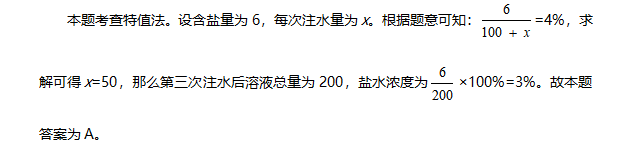 解析:本題考查雞兔同籠問題。假設(shè)2000只玻璃瓶是完好的,則可以得到2000×0.2=400元,但實(shí)際得到了393.2元,少得了400-393.2=6.8元;又知每損壞一只玻璃瓶就要倒賠0.2元,即共損失0.2+0.2=0.4元,所以損壞的玻璃瓶有6.8÷0.4=17只。故本題答案為A。