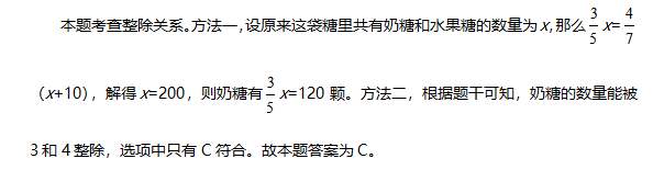 解析:本題考查奇偶特性。設(shè)做對題目的數(shù)量是x,不做或做錯(cuò)的數(shù)量是y,則有x+y=50。由和差同奇偶可知,x-y=偶數(shù),即答對題數(shù)和答錯(cuò)題數(shù)(包括不做)相差的數(shù)量是偶數(shù)。故本題答案為D。