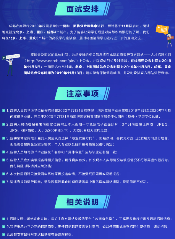 其它:獎學金獲得者、優(yōu)秀畢業(yè)生、優(yōu)秀黨員、優(yōu)秀學生干部、貧困畢業(yè)生,以及有豐富社會實踐經歷者優(yōu)先;具有與銀行業(yè)務相關的資格證書者優(yōu)先(如CFA、FRM、CPA、ACCA等);服從全行工作分配及調動者優(yōu)先。