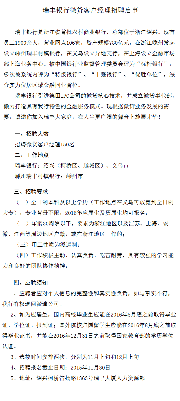 [浙江]瑞豐銀行微貸客戶經(jīng)理2015年招聘啟事