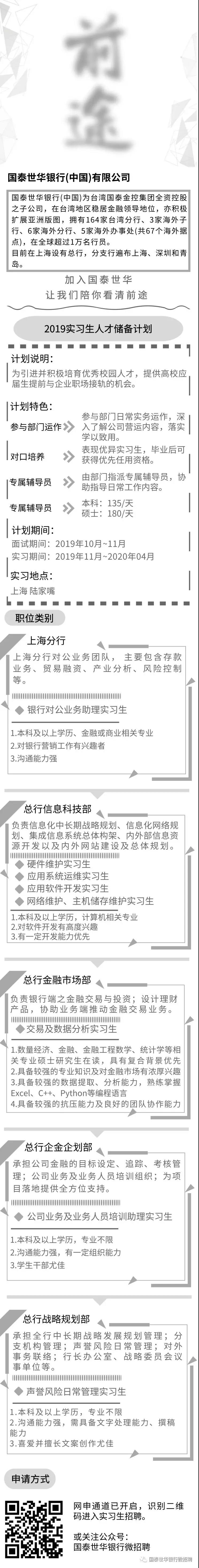 2019國泰世華銀行(中國)實習生人才儲備計劃啟動公告