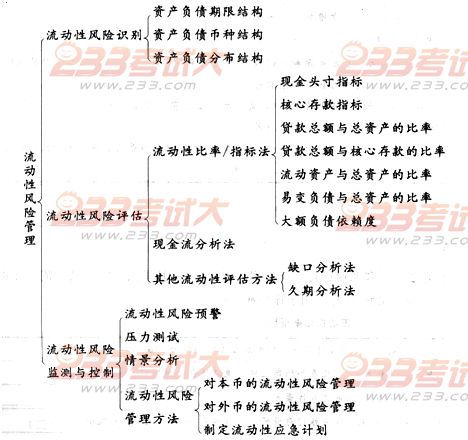 2012年銀行從業資格考試《風險管理》第六章知識精講 第六章 流動性風險管理 本章考情分析 本章主要是要求考生把握流動風險的資產負債期限結構、幣種結構、分布結構,流動性比率指標(7個指標),缺口分析法和久期分析法,流動風險的預警和如何運用壓力測試法和情景分析法對未來流動性狀況作出預測,以及我國商業銀行目前普通采用的流動性風險管理方法。 本章基本架構