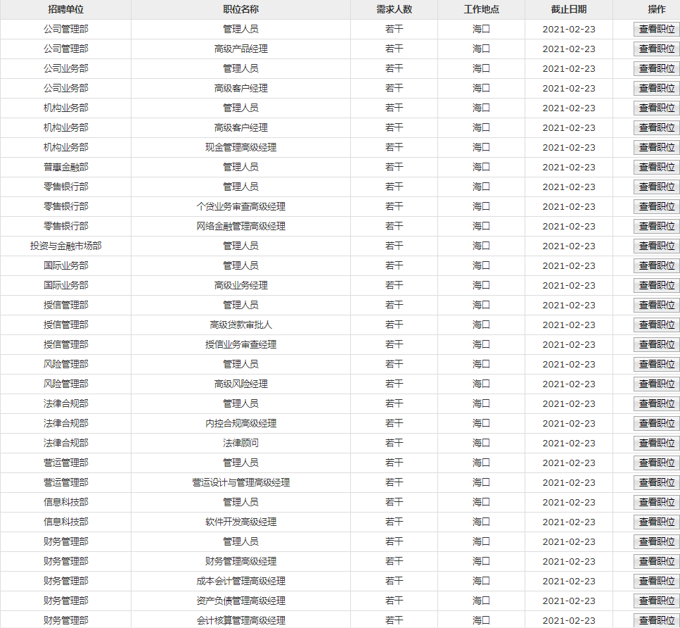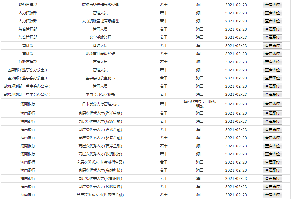 為進一步加強人才隊伍建設,率先建立與自由貿(mào)易區(qū)(港)需求相匹配的金融服務架構(gòu),提升服務自由貿(mào)易區(qū)(港)和美好新海南建設的能力和水平,現(xiàn)啟動2019年社會招聘工作,面向境內(nèi)外誠邀有志于攜手海南銀行共同發(fā)展的國際化、專業(yè)化、復合型、創(chuàng)新型人才加盟。我行將為各類人才提供廣闊的成長發(fā)展空間、豐富的培訓提升資源、領先于市場競爭力的薪酬待遇和健全完善的福利保障(包括外來高端人才購房、家屬就業(yè)、子女入學等相關配套措施),具有國際化視野的高端金融人才應聘我行,崗位、職務、薪酬均可面議。