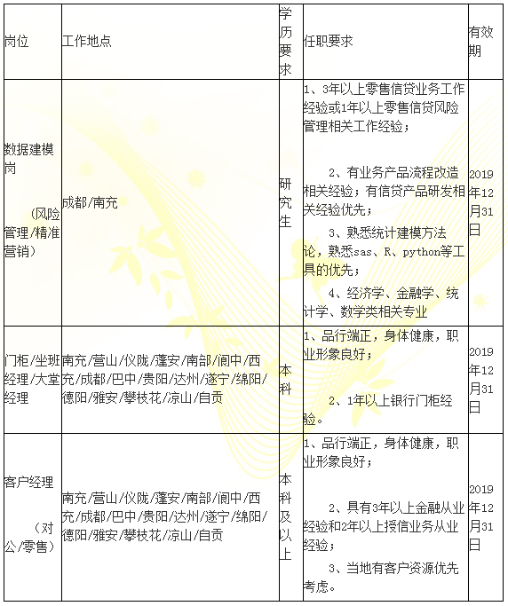 根據業務發展需要,四川天府銀行現面向社會公開招聘以下崗位,誠邀有志之士加入,共創美好未來!請點擊下載《應聘登記表》,投遞簡歷至recruitment@tf.cn。郵件標題格式:應聘崗位(地區),如:應聘門柜(蓬安)。