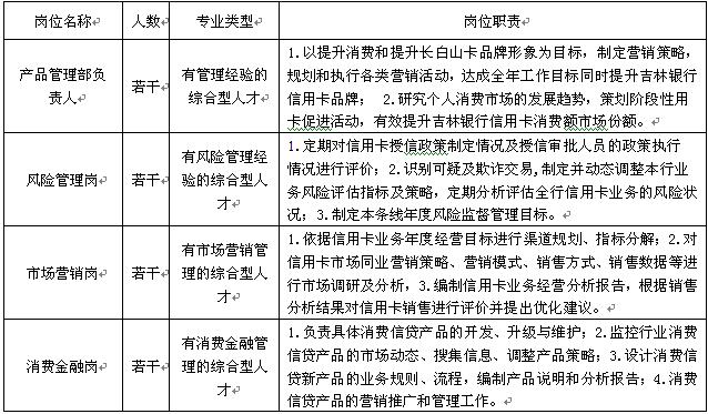 吉林銀行信用卡中心是個人金融總部下設(shè)的一級部門,主要承擔(dān)著整個吉林銀行信用卡產(chǎn)品開發(fā)、市場推廣、進(jìn)件審批、高風(fēng)險客戶管理、24小時客戶服務(wù)等職責(zé)。現(xiàn)因吉林銀行總行信用卡中心業(yè)務(wù)發(fā)展需要,誠邀有識之士加盟。