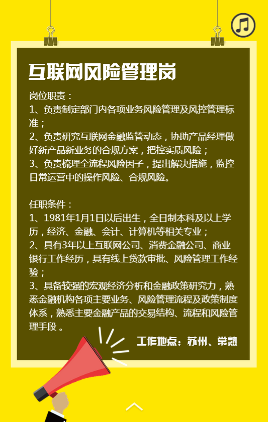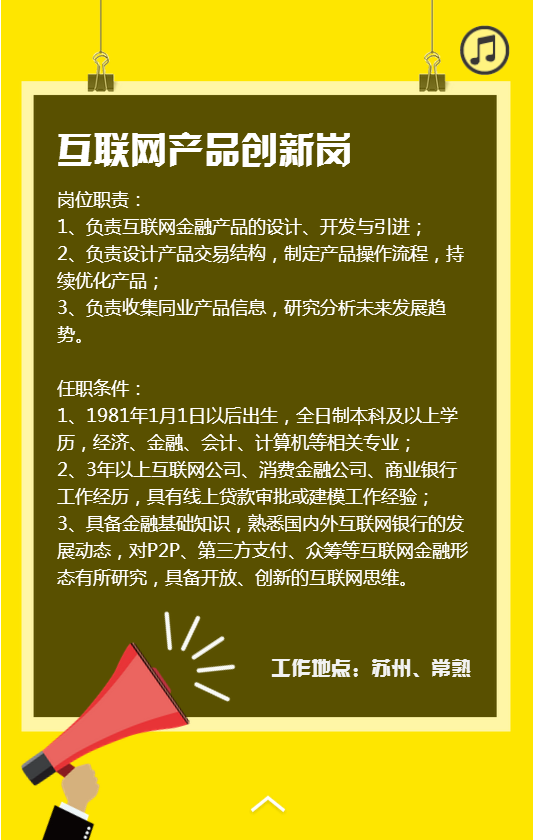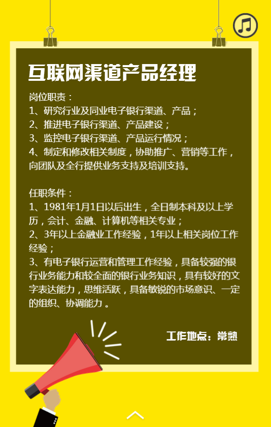 2016年常熟農(nóng)商銀行直銷銀行招聘啟事已在銀行招聘網(wǎng)發(fā)布,報名時間截至2016年12月31日,詳情如下: