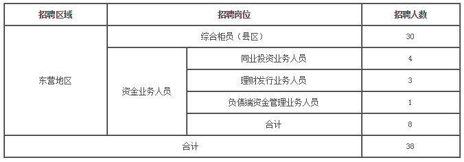 本次招聘范圍為東營地區(qū),共招聘38人,具體招聘崗位及人數(shù)見下表: