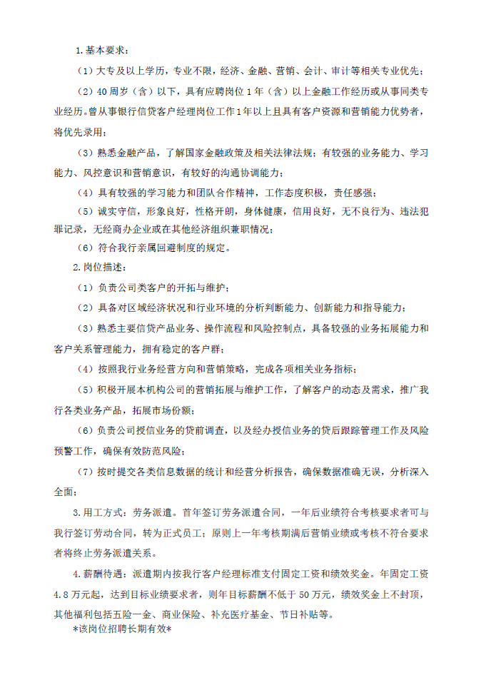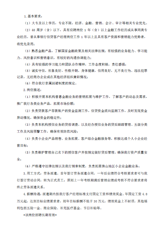 工作經(jīng)驗(yàn):具有應(yīng)聘崗位1年(含)以上金融工作經(jīng)歷或從事同類專業(yè)經(jīng)歷