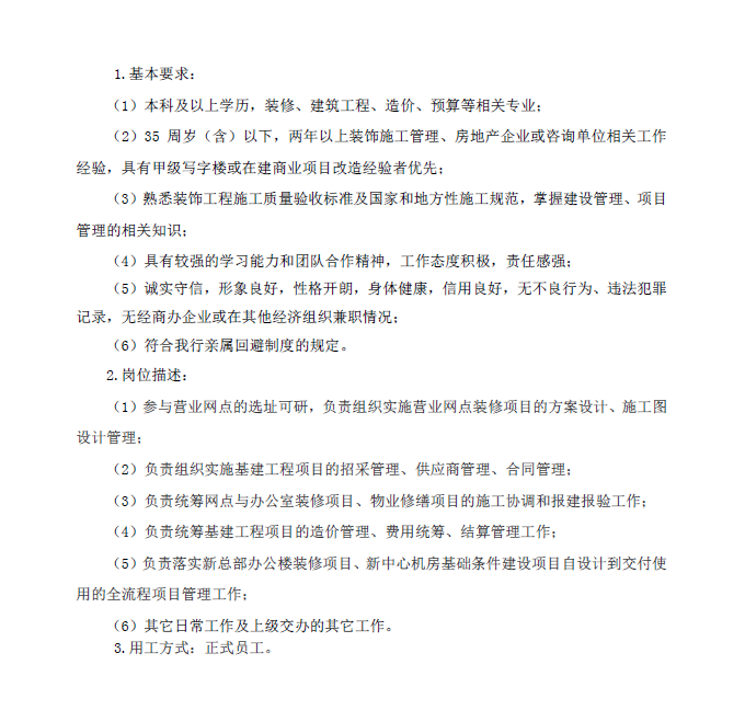 工作經(jīng)驗(yàn):兩年以上裝飾施工管理、房地產(chǎn)企業(yè)或咨詢單位相關(guān)工作經(jīng)驗(yàn)