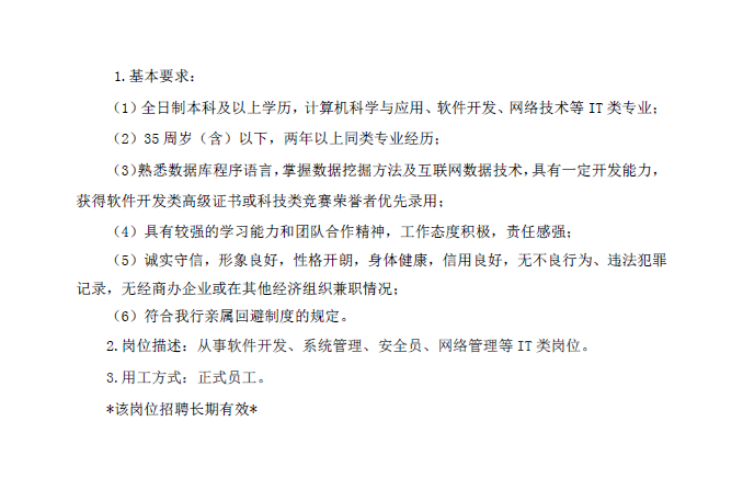 學(xué)歷要求:全日制本科及以上學(xué)歷,計(jì)算機(jī)科學(xué)與應(yīng)用、軟件開發(fā)、網(wǎng)絡(luò)技術(shù)等IT類專業(yè)