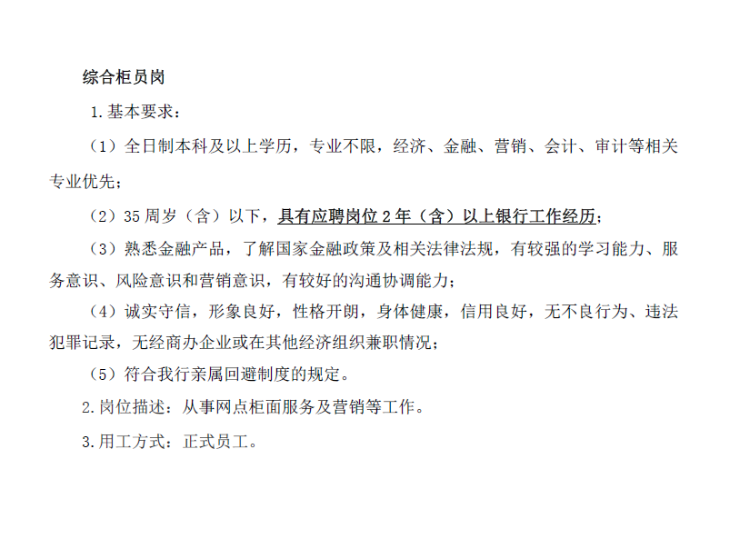 工作經驗:具有應聘崗位2年(含)以上銀行工作經歷