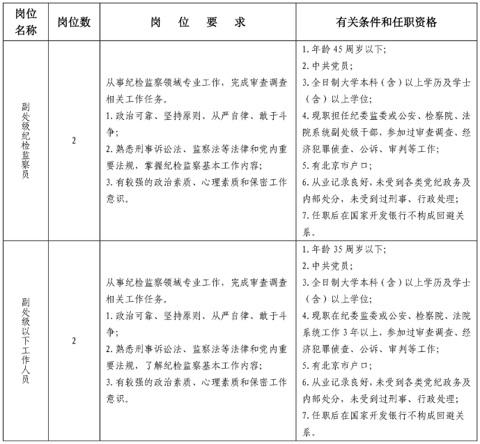 中央紀(jì)委國(guó)家監(jiān)委駐國(guó)家開發(fā)銀行紀(jì)檢監(jiān)察組(以下簡(jiǎn)稱“派駐組”)社會(huì)招聘干部公告如下: