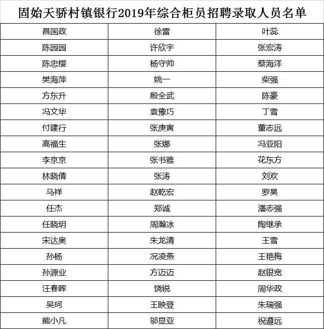 根據我行2019年7月10日至7月12日綜合柜員招聘筆試、面試綜合考評成績,同時經發起行鄂爾多斯農商銀行審核通過,現將錄取人員名單公布如下,請接到錄取通知的人員于2019年7月29日上午8:00到固始天驕村鎮銀行總行(陳元光大道縣政府西)三樓大會議室報到。