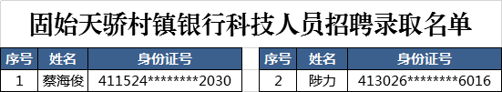 [河南]2020年固始天驕村鎮銀行客戶經理、科技人員招聘錄取通知