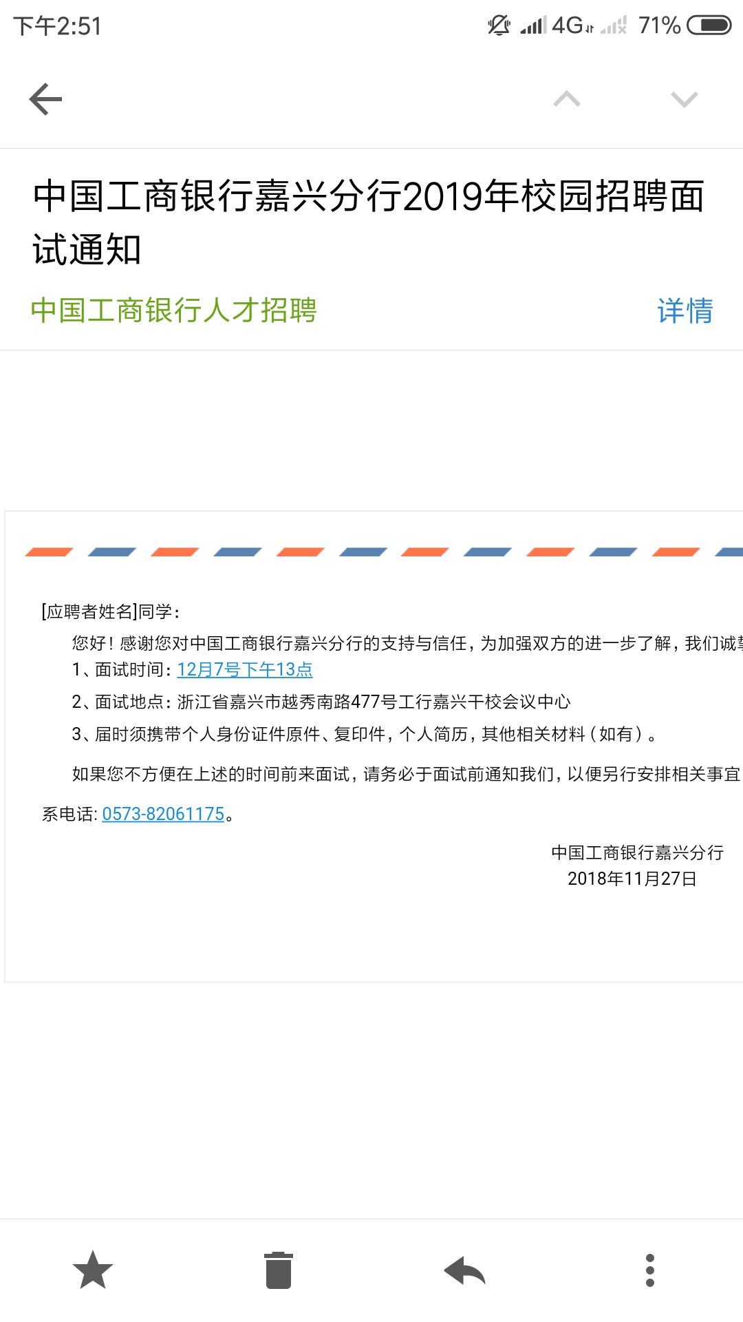[浙江]2019年中國工商銀行嘉興分行校園招聘面試通知