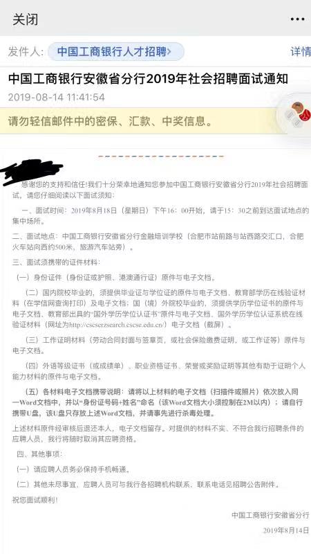 [安徽]2019年中國工商銀行安徽省分行社會招聘面試通知