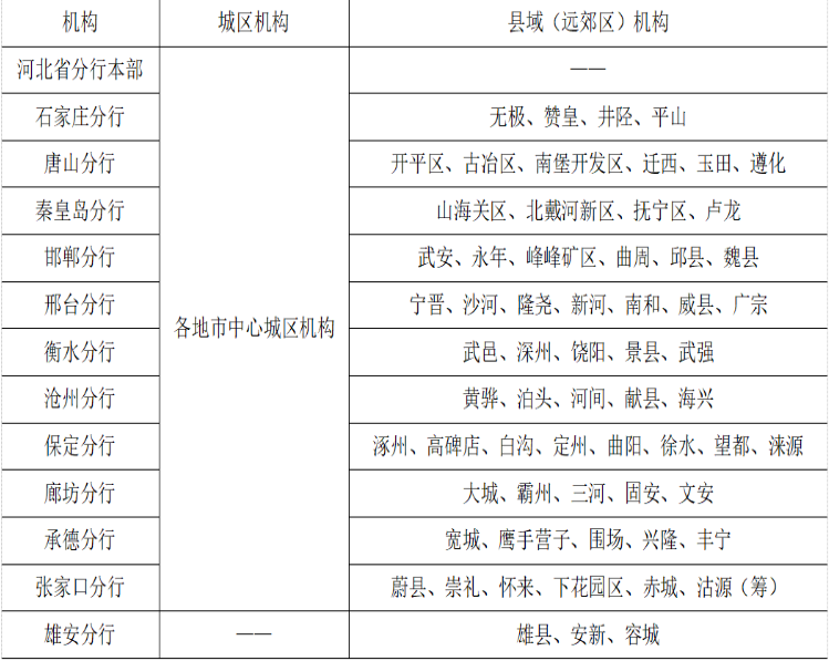 中國工商銀行河北省分行轄內城區及縣域分支機構。