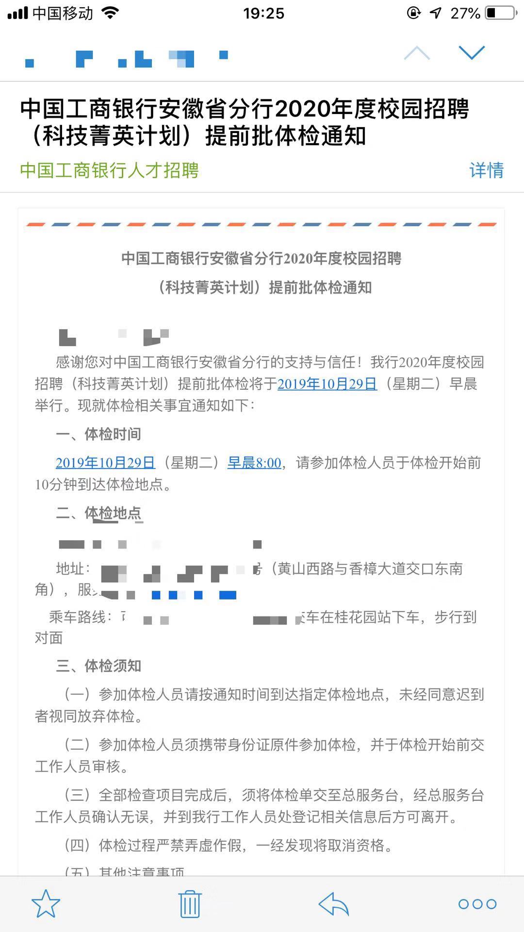 2020年中國工商銀行安徽省分行校園(科技菁英計劃)提前批次體檢通知