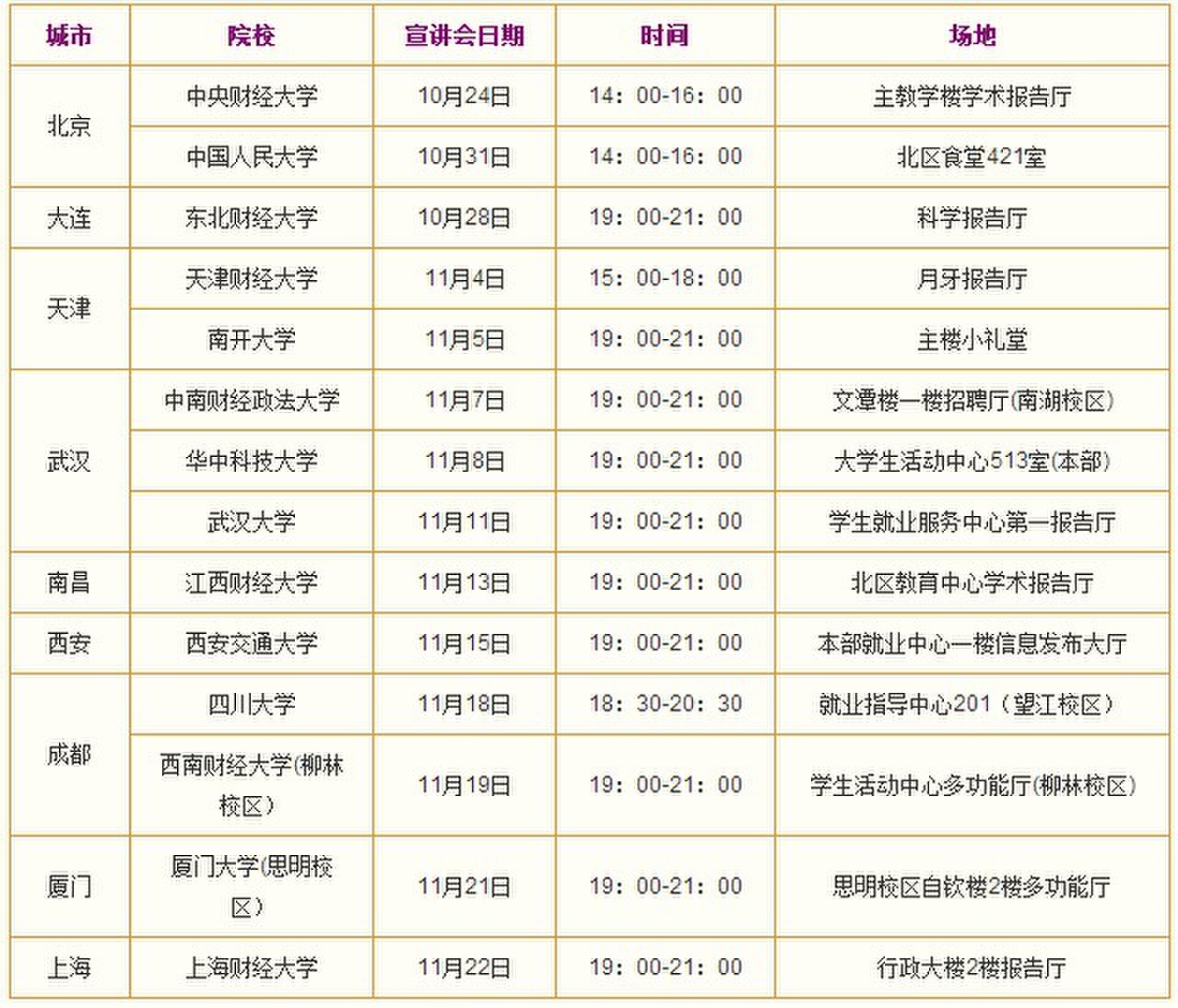 光大銀行2014校園招聘宣講會行程表