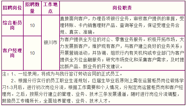 中國(guó)光大銀行銀川分行是總行設(shè)立的第38家一級(jí)分行,于2014年8月啟動(dòng)籌備工作,2015年11月19日試營(yíng)業(yè), 2016年5月13日正式開業(yè)。銀川分行成立以來,始終秉承“以客戶為中心,以市場(chǎng)為導(dǎo)向”的經(jīng)營(yíng)理念,團(tuán)結(jié)奮進(jìn),銳意進(jìn)取,不斷優(yōu)化服務(wù),各項(xiàng)業(yè)務(wù)保持著快速穩(wěn)健的發(fā)展勢(shì)頭。中國(guó)光大銀行銀川分行將致力于打造“有為才有位,有位須有為,無為即無位”的選人、用人、育人環(huán)境,堅(jiān)持“業(yè)績(jī)用人,品德用人,德才兼?zhèn)洌缘聻橄?rdquo;的標(biāo)準(zhǔn),堅(jiān)持公平、公正的選拔任用機(jī)制,為您打造良好的職業(yè)成長(zhǎng)平臺(tái)。熱忱歡迎廣大優(yōu)秀畢業(yè)生能加盟到中國(guó)光大銀行銀川分行的團(tuán)隊(duì)中來,施展您的才華,光大與您共精彩!