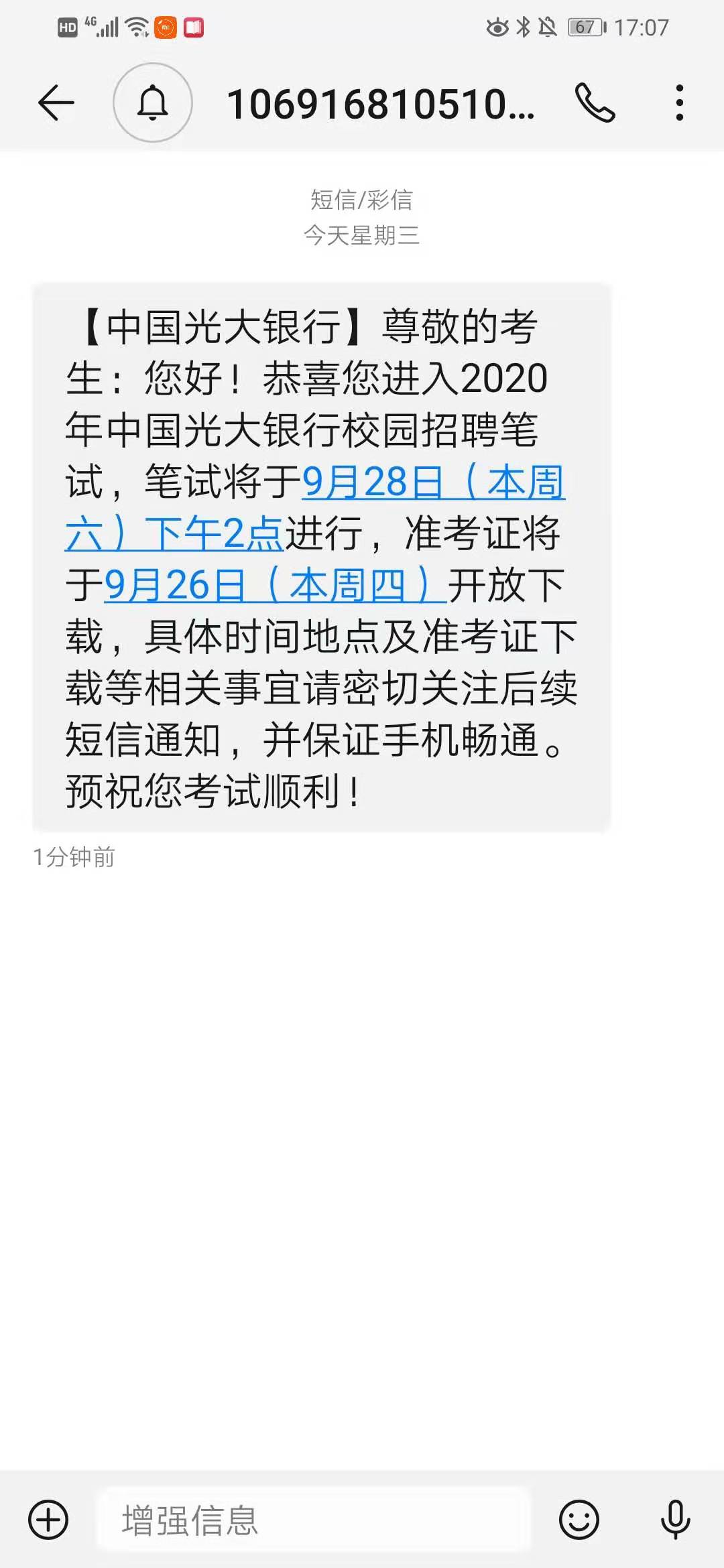 [河南]2020年中國光大銀行河南分行校招筆試通知