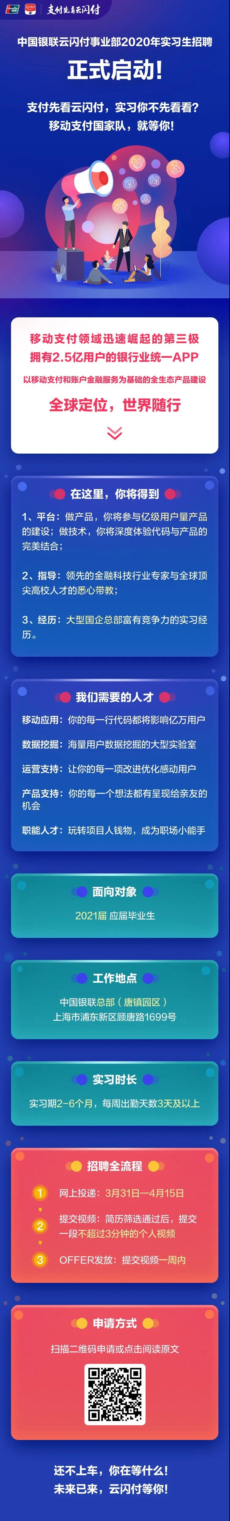 2020年中國銀聯云閃付事業部實習生招聘正式啟動公告