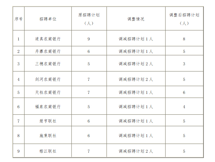 根據《貴州省農村信用社高校畢業生專場網絡招聘活動招聘簡章》有關規定,現對部分招聘單位招聘計劃進行調整,調整后全省農信社招聘計劃總數由343人減至331人。現將相關招聘單位招聘計劃調整情況通告如下: