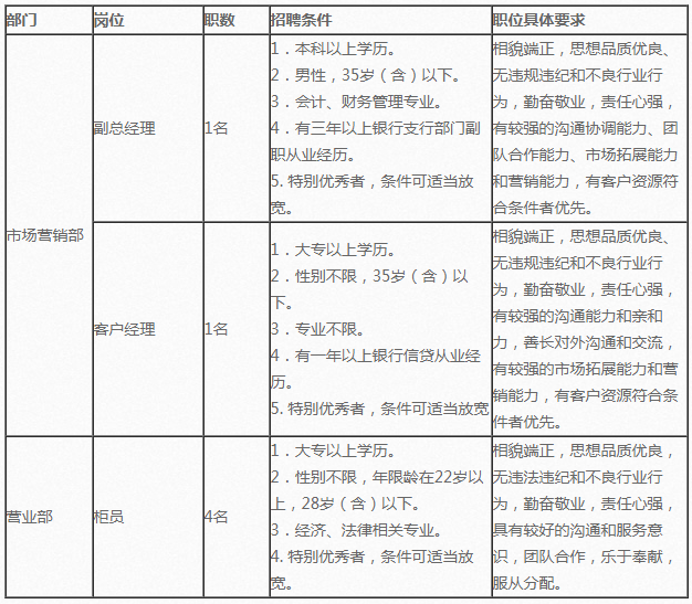 貴州銀行發(fā)起成立的新型農(nóng)村金融機構(gòu),是服務(wù)于白云區(qū)的地方性股份制商業(yè)銀行。本行以“服務(wù)三農(nóng),服務(wù)中小企業(yè),服務(wù)百姓”為經(jīng)營宗旨,以打造“三農(nóng)”貼心的銀行,“中小企業(yè)”稱心的銀行,“城鄉(xiāng)居民”合心的銀行為目標(biāo),致力為白云區(qū)的中、小、農(nóng)、客戶提供全方位的金融服務(wù)。現(xiàn)因業(yè)務(wù)發(fā)展需要,特向社會公開招聘正式在編合同制員工,誠邀有志于同本行共同成長的優(yōu)秀人才加盟,一經(jīng)錄用將提供廣闊的發(fā)展空間及當(dāng)?shù)馗挥懈偁幜Φ男匠旮@觥?/div>