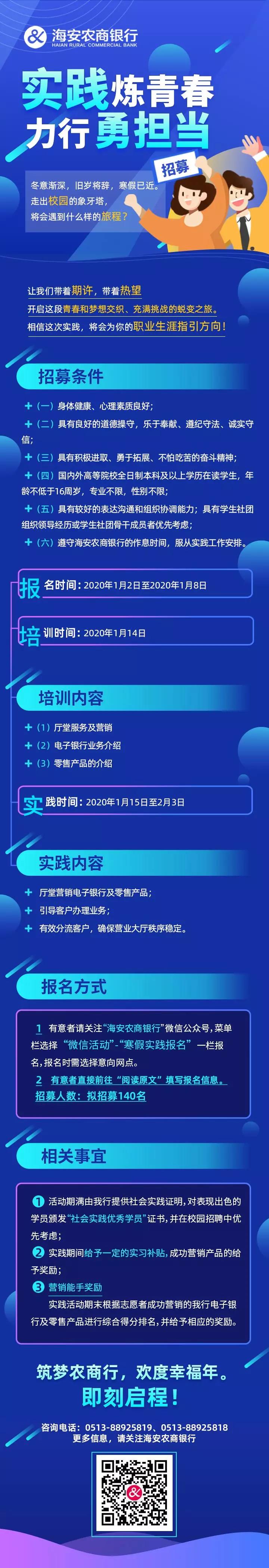 主頁 > 農村商業銀行招聘 > 海安農商銀行招聘 > [江蘇]2020海安農商銀行寒假大學生實習生招聘公告