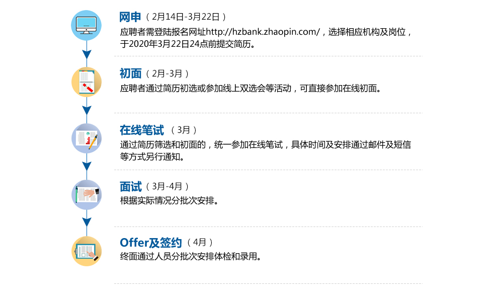 2、筆試及面試等相關安排本行將及時以短信、郵件、電話方式通知。請確保簡歷中填寫的聯系方式(手機、郵箱)正確,并在校招期間保持通訊暢通。