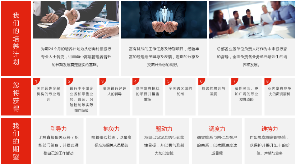 為期24個月的培養(yǎng)計劃為從您向村鎮(zhèn)銀行專業(yè)人士轉(zhuǎn)變,進(jìn)而向中高層管理者晉升的長期發(fā)展奠定堅實的基礎(chǔ)。