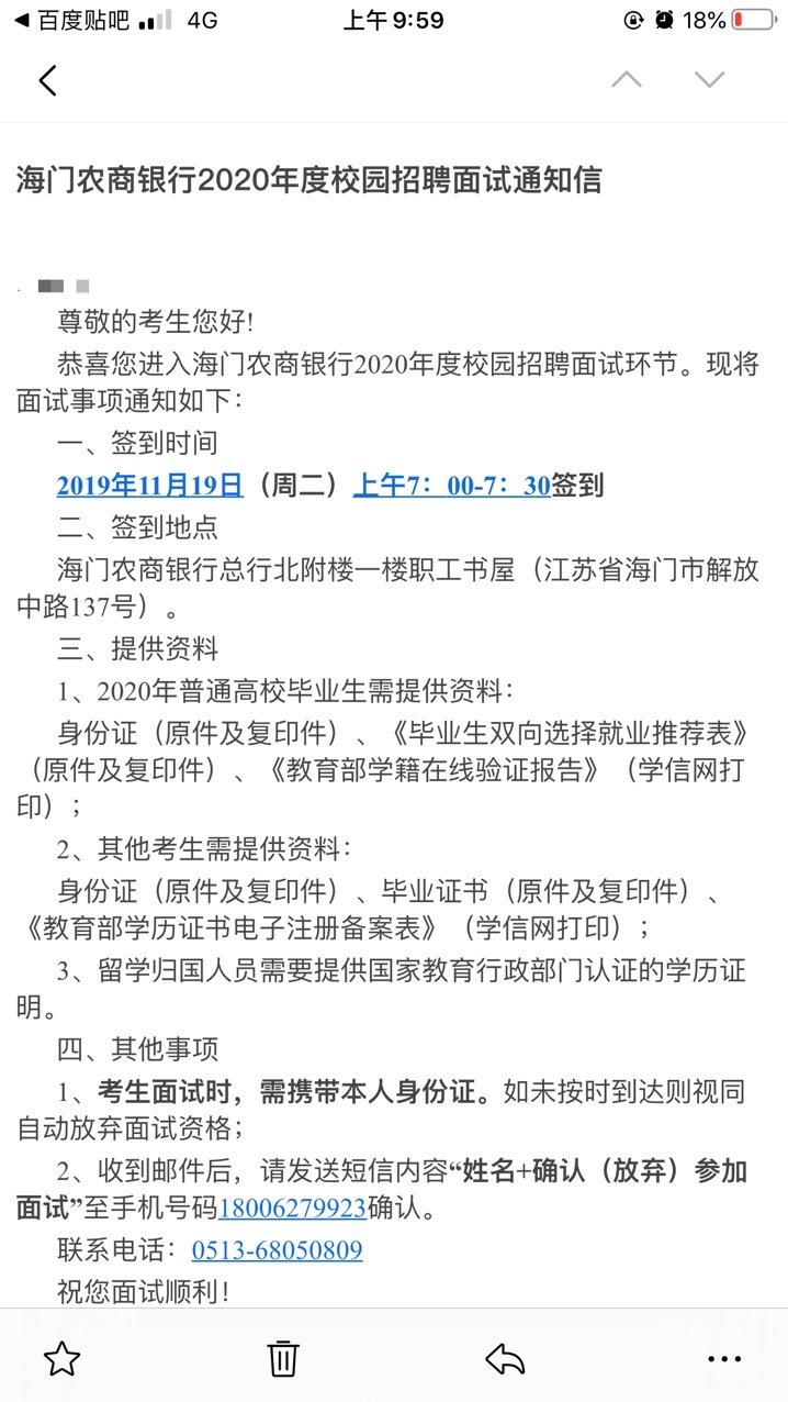 [江蘇]2020海門農商銀行校園招聘面試通知