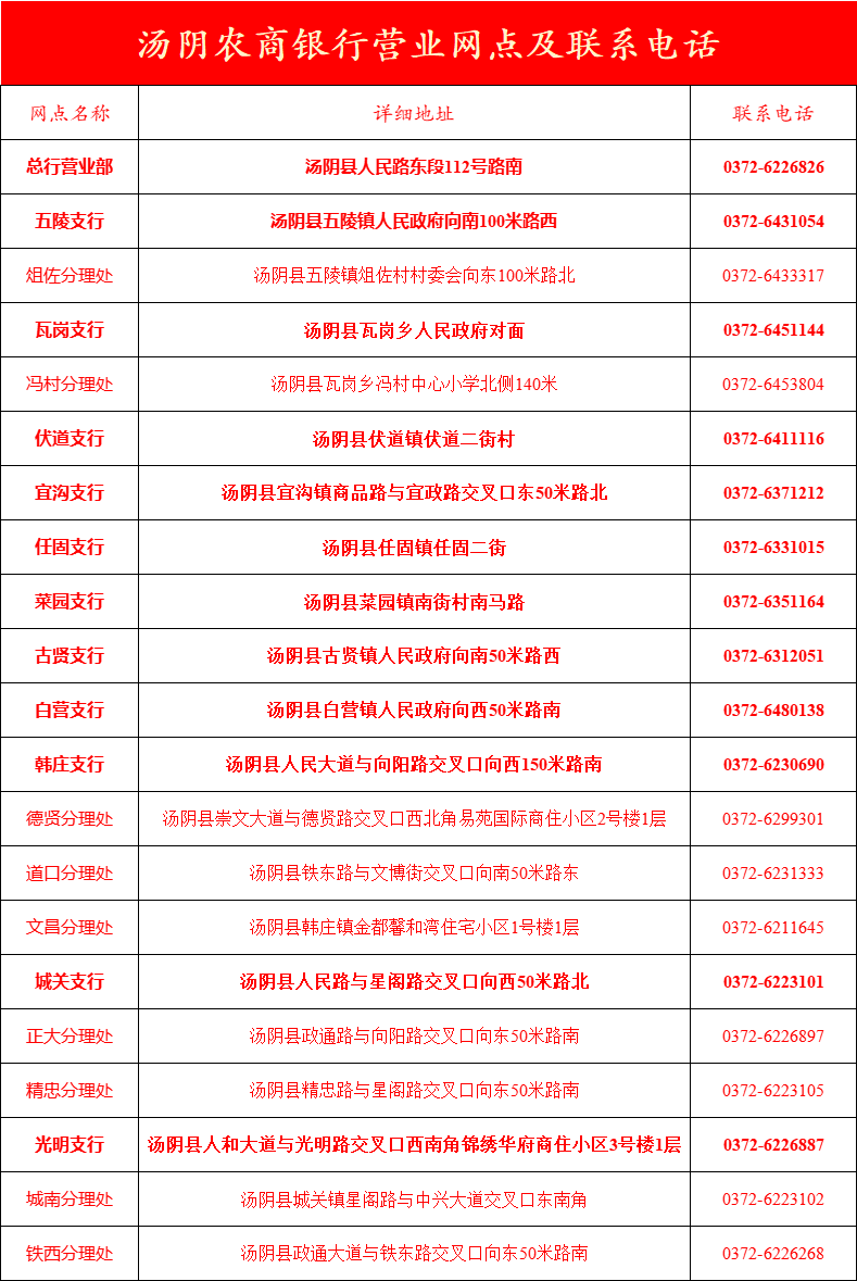湯陰農商銀行轄內機構各營業網點