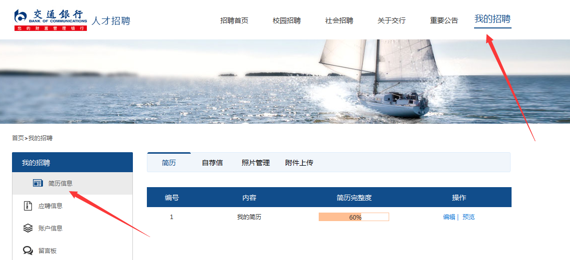 二、登陸成功后首先點(diǎn)擊右上側(cè)的“我的招聘”,點(diǎn)擊簡歷信息添加個人簡歷,已參加過銀行秋季招聘的考生可直接點(diǎn)擊編輯,修改簡歷(參加秋招的同學(xué)切記檢查簡歷,去除過期內(nèi)容,優(yōu)化簡歷)。